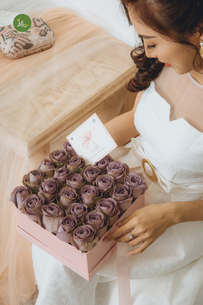The combination of white roses and blue flowers in this beautiful bouquet